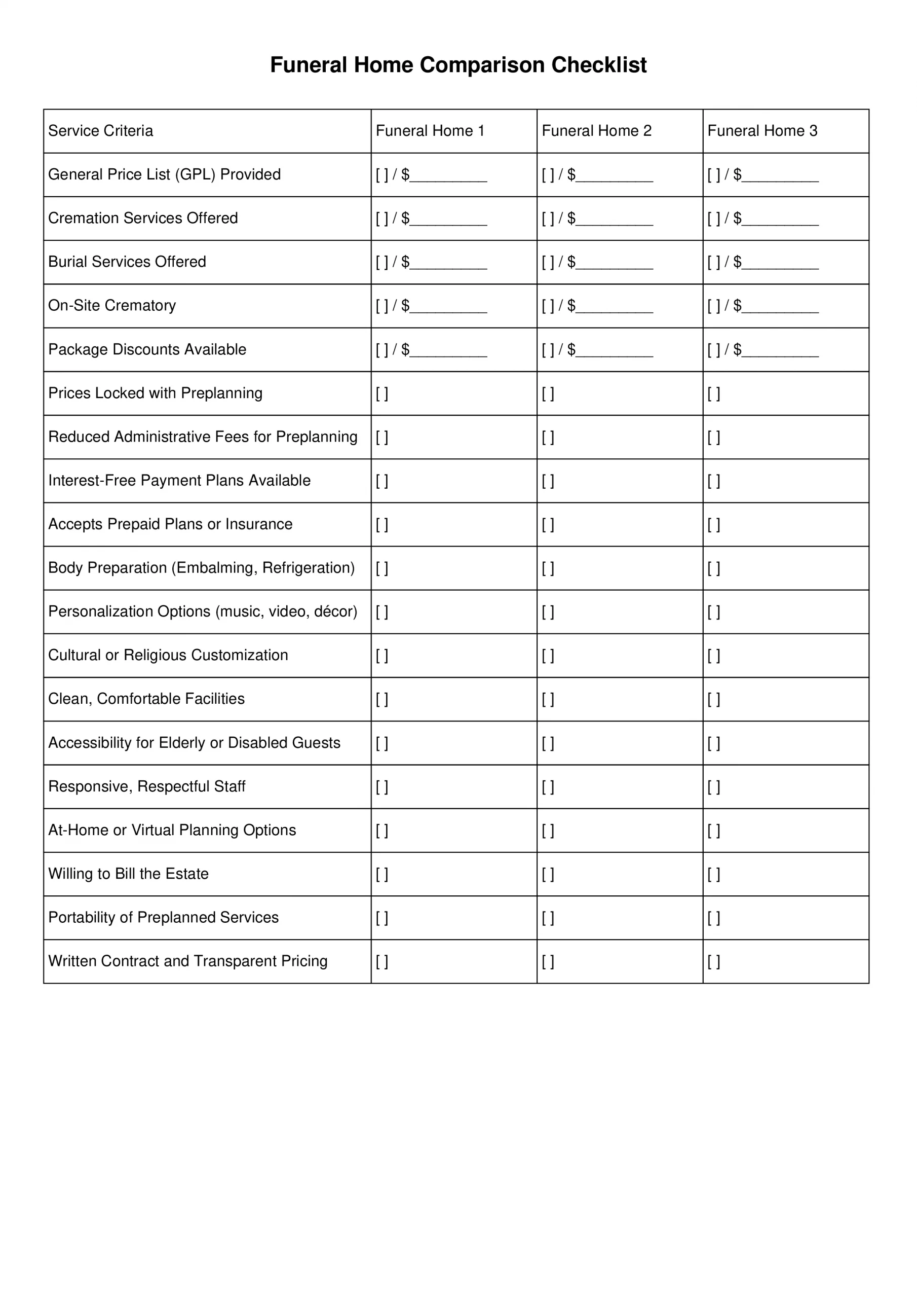 FUNERAL HOME COMPARISON CHECKLIST FORM